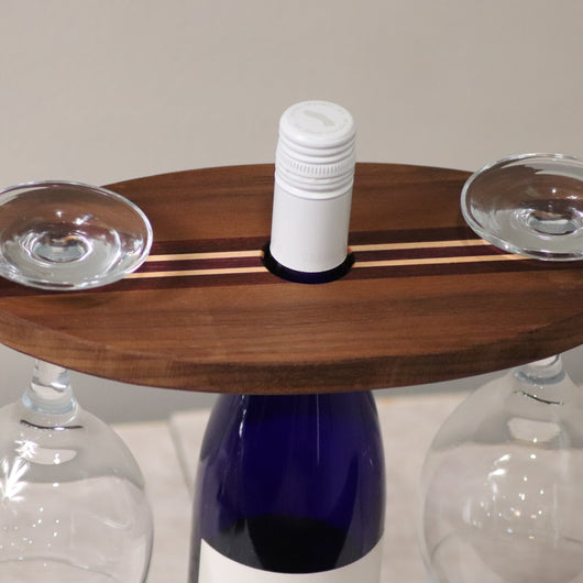 The oval Wine Caddy design has indentions on each end to hold a pair of glasses next to the wine bottle. A matching rectangle board is a perfect size for sliced cheese or cheese spread to accompany the wine.