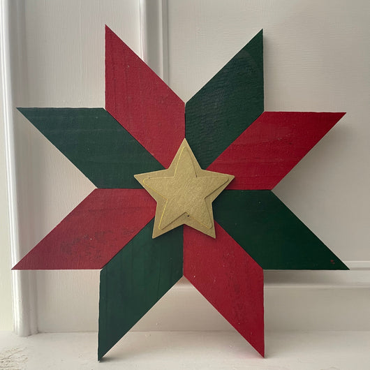 Rustic holiday star can be used on a mantel or hung on the wall. Decorate any room in the house with this red, green and gold 8 point star. Versatile and lightweight, this item blends with all types of Christmas decorations.