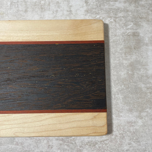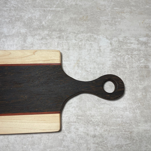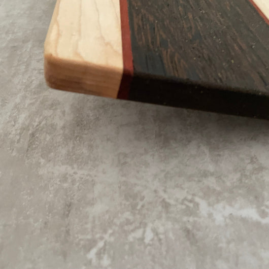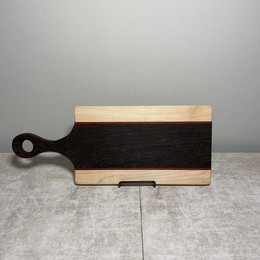 The colorful assortment of woods used as well as the overall design makes this board perfect for displaying in the kitchen or in dining space when not in use.