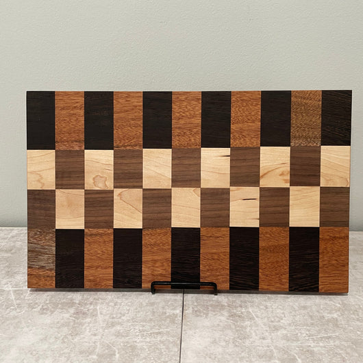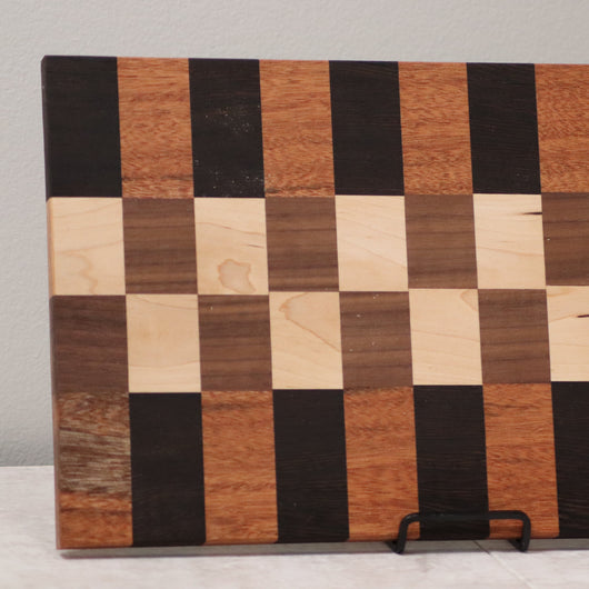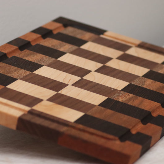 Multiple exotic wood types are used in this classic Checker Board inspired masterpiece. Along with being beautiful, this board is functional because using natural hardwood cutting boards protects the knife’s edge.